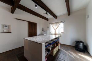 奥に併設しているパン教室の中心には、強度に優れた天板を使って仕上げた造作のアイランドカウンター